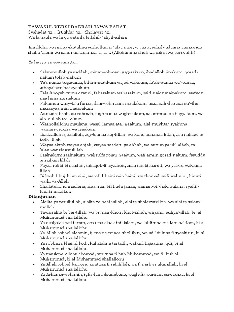 Sahabatku semua yang semoga dirahmati allah, tawassul artinya adalah mendekatkan diri kepada allah bacaan tasawul lengkap dan urutannya. 1.1 bacaan tasawul lengkap dan urutannya. Wa ilaa hadloroti jamii'i auliyaa illahi ta'ala mim masyaa riqil ardhi ilaa waghoribiha fii barriha wa bahrihaa. Hadiah fatihah kepada rasulullah nabi muhammad s.a.w. Ungkapan syai'un lillahi lahumul fatihah sangat familiar di telinga kaum nahdliyyin, tetapi tak banyak yang tahu maknanya.